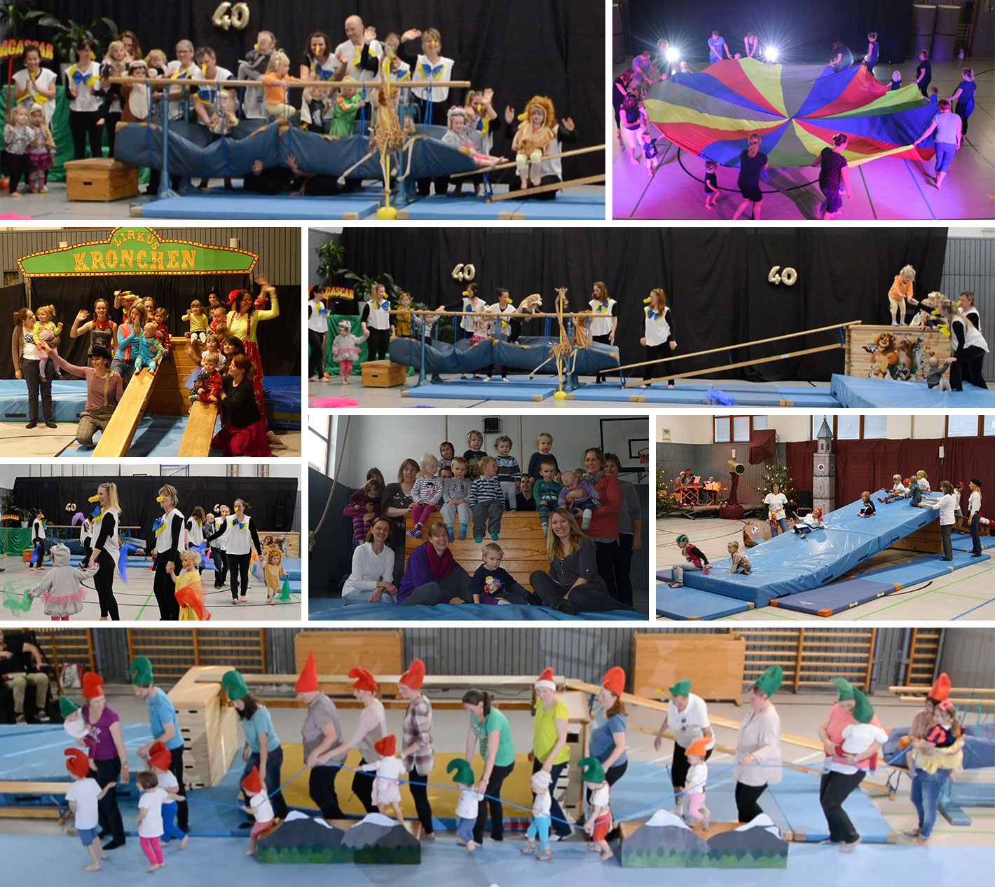 Gemeinsam mit unseren Mamas, Papas oder auch Omas treffen wir uns immer Donnerstags von 16:15 bis 17:30 Uhr in der Halle und turnen dabei zusammen über Gerätelandschaften, Bodenflächen und abenteuerliche Hindernissen. Meistens sind wir ca. 35 Kinder. Willkommen ist jeder, der schon alleine laufen kann und Spaß am Turnen hat.