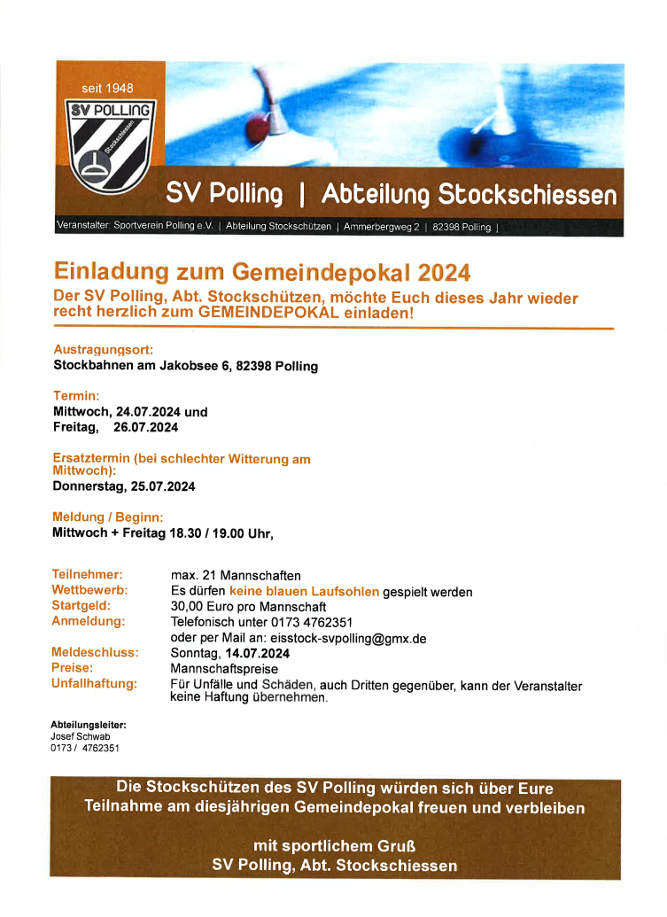 Das Stockschiessen hat in Polling schon eine lange Tradition und ist eine moderne Sportart für Jugend, Damen, Herren und Senioren. Es kann im Winter auf Natur- oder Kunsteis und im Sommer auf Asphalt oder Pflaster zum Vergnügen.